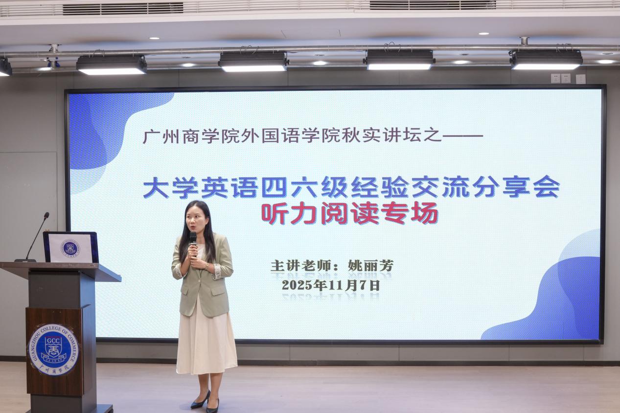 11月7日下午,外国语学院教工党支部与广州商学院学生会在第八教学楼202室联合举办“广州商学院2025秋实讲坛——大学英语四六级听力与阅读专场经验交流会”。本次活动特邀外国语学院党总支宣传委员潘文晗担任嘉宾,由外国语学院教工第二党支部宣传委员、大学英语二教研室主任姚丽芳老师担任主讲人,并邀请经济学院国贸2403班梁泽贤同学作为学生嘉宾参与分享。