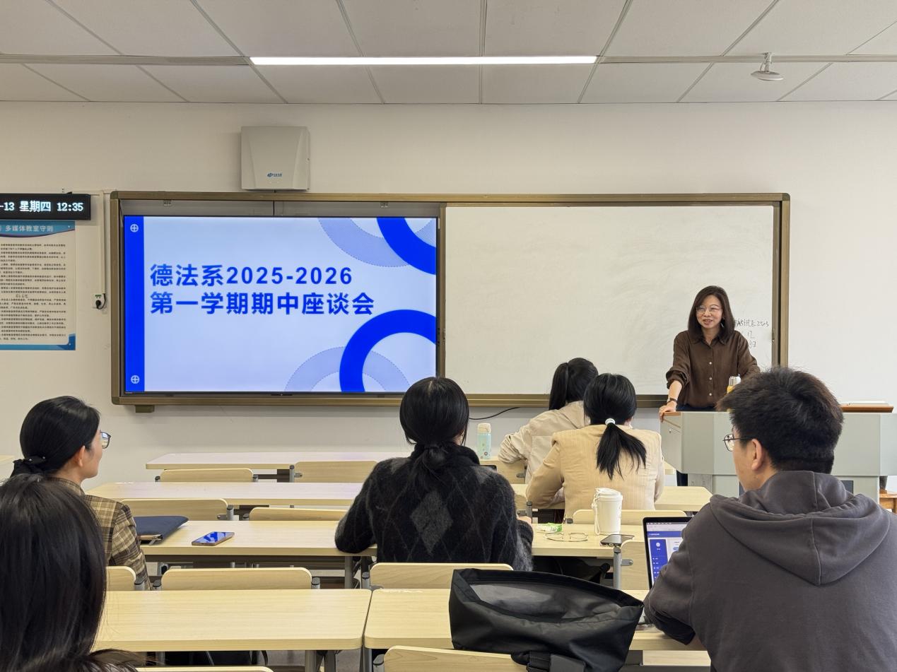11月13日,广州商学院外国语学院德法系顺利召开本学期期中教师座谈会。会议由系主任周昳旸老师主持,德语专业负责人潘艳老师及德法系全体教师出席。本次座谈会围绕人才培养、教学改革、学生发展与教师成长等核心议题展开深入交流,旨在顺应时代发展趋势,提升专业建设质量,推动外语教育与社会需求深度融合。